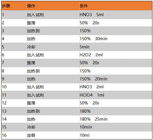 稱取0.5g濕樣(標(biāo)準(zhǔn)物質(zhì)0.2g,80℃烘4h)于干凈透明的聚四氟乙烯消解管中,將消解管擱在消解架上,放置在石墨消解儀上。具體程序如下: