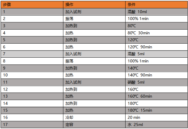 稱取樣品約0.5g于消解管中,放置在消解架上。分別加入混酸10ml(硝酸、高氯酸混合7:1),100%振蕩強度一分鐘。在80度溫度下,預(yù)消解半小時。升溫至120度1.5小時,補加5ml混酸,升溫至140度1.5小時,補加5ml硝酸,升溫至160度一小時,升溫至180度15min趕酸,至白煙冒盡。方法如下: